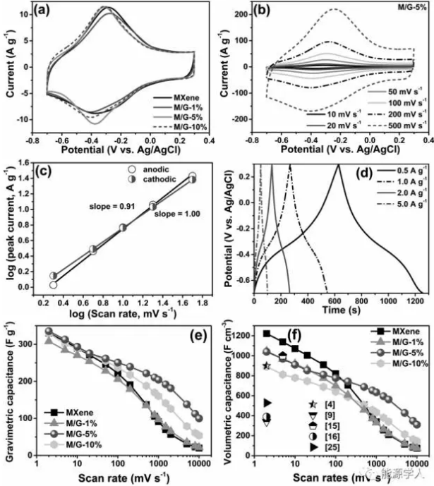 圖2(a)在3MH2SO4電解質中,掃速為20mV/s時,MXene和MXene/rGO的CV圖;(b)M/G-5%電極在不同掃速下的CV圖;(c)M/G-5%電極的峰值電流與掃描速率(2-50mV/s)之間的關系圖;(d)M/G-5%電極在不同電流密度下的充放電曲線圖;(e-f)MXene和MXene/rGO電極在不同掃速下的質量比電容和體積比電容圖。