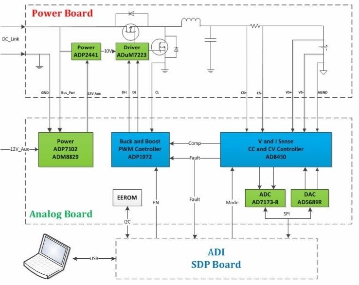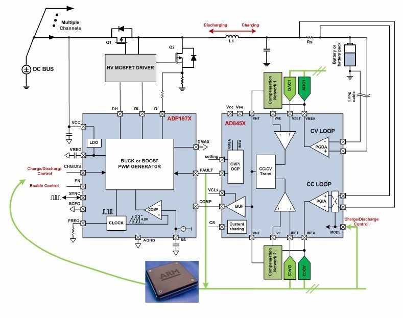 為此,ADI在專為低、中、高三種容量鋰電池分容化成設(shè)備制定的AD8450/1精密模擬前端與控制器以及ADP1972降壓/升壓PWM控制器中,摒棄了以往將電池能量放電至阻性負(fù)載的線性架構(gòu),轉(zhuǎn)而通過使用PWM控制器提供電流,并將其引導(dǎo)回電網(wǎng)或?qū)ζ渌姵爻潆姡瑢?shí)現(xiàn)了高效環(huán)保的目的。